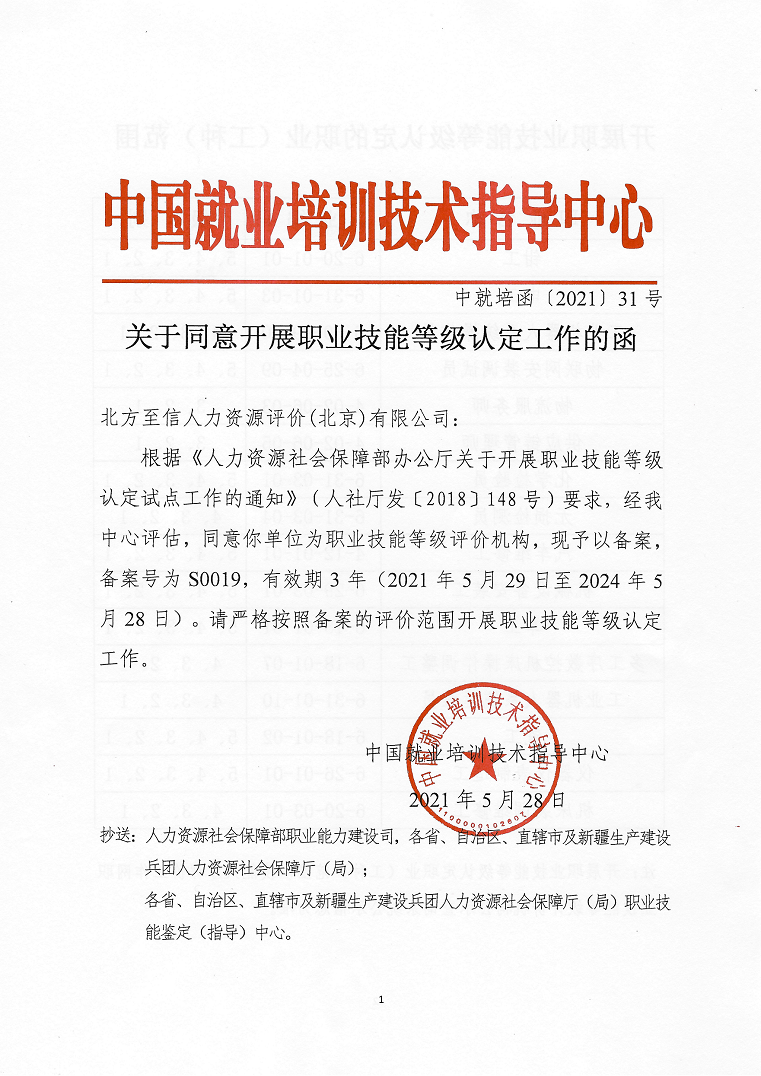 5月28日,人力資源社會(huì)保障部中國(guó)就業(yè)培訓(xùn)技術(shù)指導(dǎo)中心發(fā)布了《關(guān)于同意開(kāi)展職業(yè)技能等級(jí)認(rèn)定工作的函》(中就培函〔2021〕31號(hào)),北方至信人力資源評(píng)價(jià)(北京)有限公司(以下簡(jiǎn)稱“北方至信”)成為首家央企全國(guó)性社會(huì)培訓(xùn)評(píng)價(jià)組織職業(yè)技能等級(jí)認(rèn)定機(jī)構(gòu)。