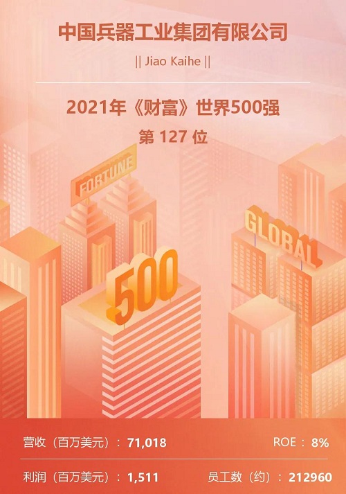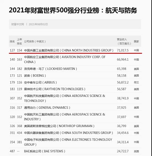 中國兵器工業集團有限公司位列世界500強第127位,連續12年上榜。