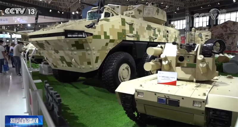 總臺央視記者 吳天白:我們可以看到,本屆航展兵器館裝備的排列不再是同類型裝備相鄰排列,履帶式的坦克就會搭配輪式無人車,而輪式裝甲車就會配備履帶式無人車進行輔助,采用了一種“輪履結合”的組合形式。