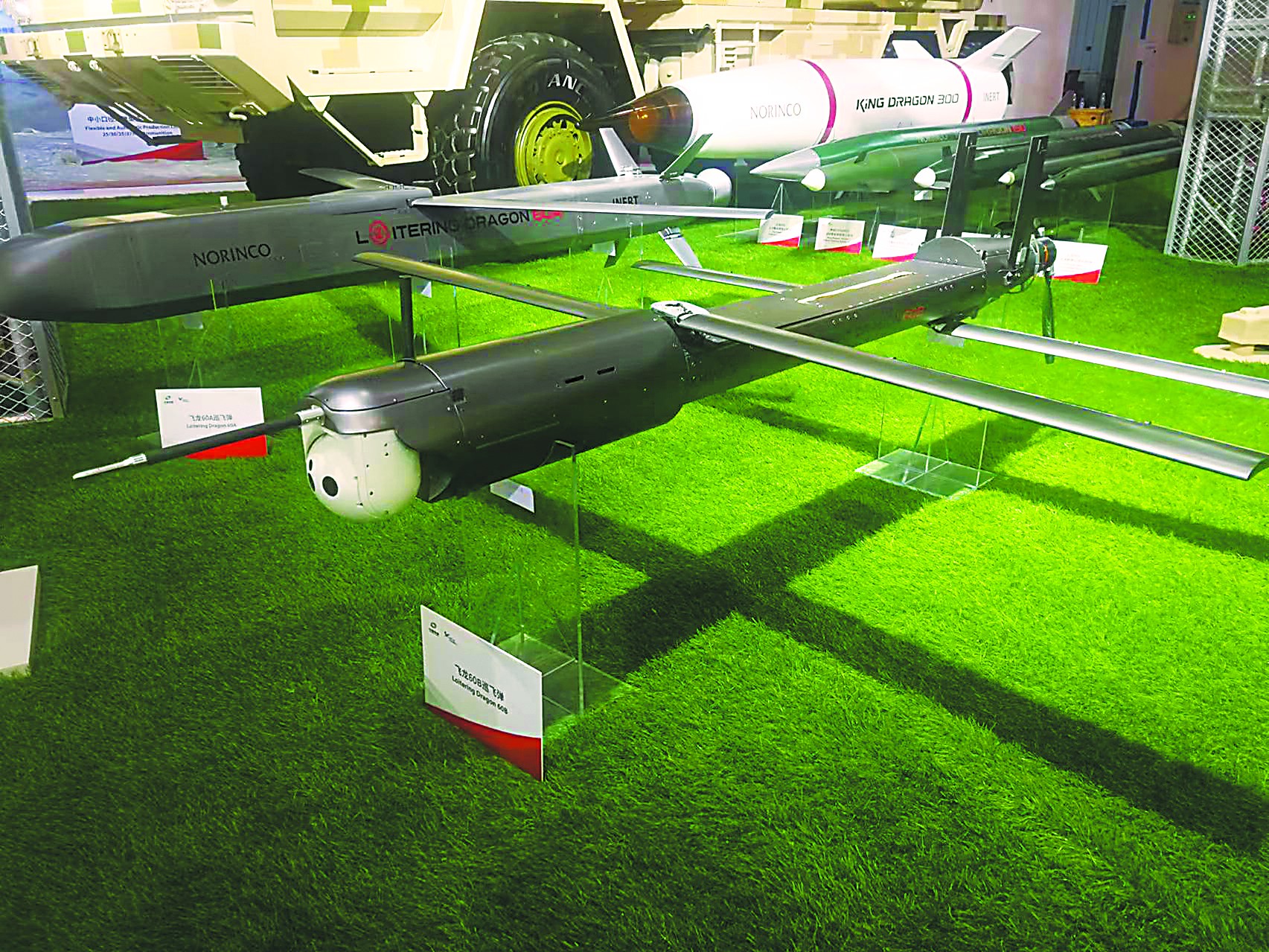 兵器工業集團展出的SR-5遠程火箭炮系統被稱為“中國版‘海馬斯’”,它的特點之一就是能共架發射“飛龍-60”巡飛彈,從而引導火箭炮對數百公里外目標的遠程精確打擊。