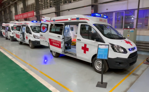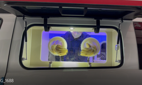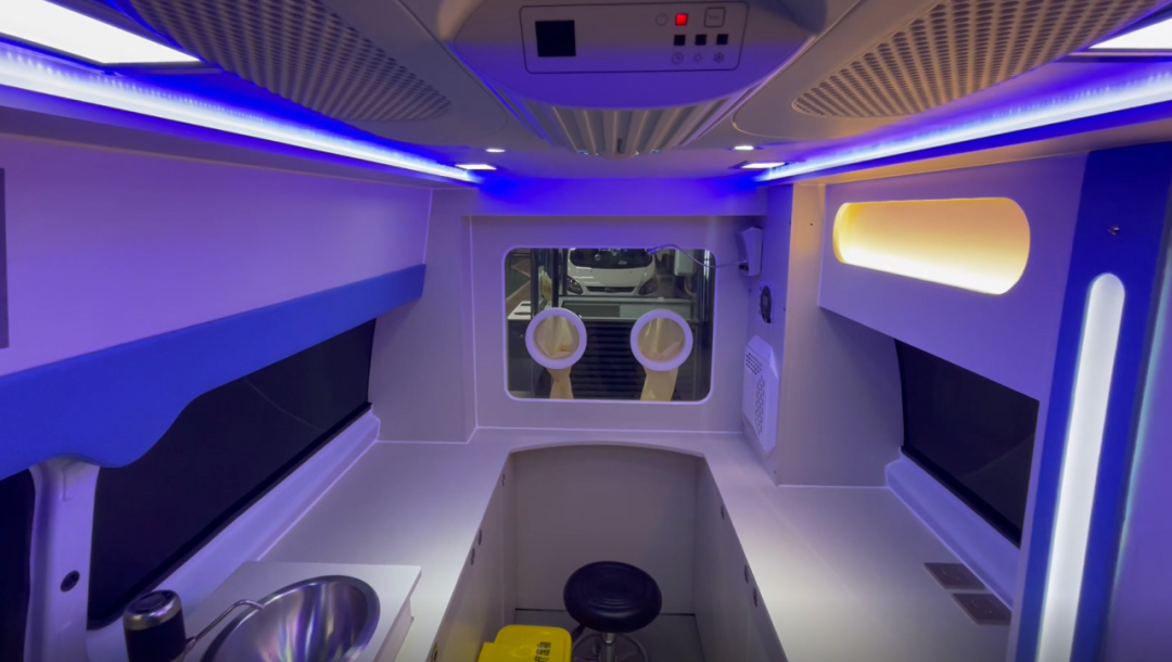 核酸采樣車采用福特新全順中軸中頂汽油款底盤,外觀與普通救護車類似,內部上裝醫療輔助系統、空調系統、照明系統、新風過濾系統等。其中,最為核心的醫療輔助系統包括采樣窗口、隔離手套、車載冰箱、洗手池系統、凈水桶、污水箱、污物桶、車載飲水機等。