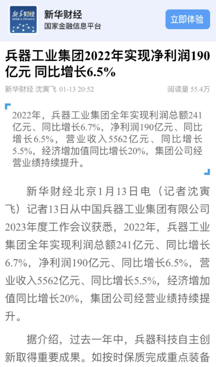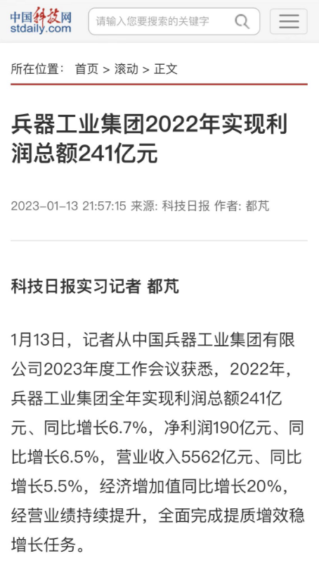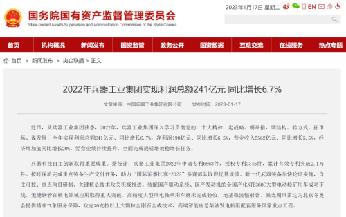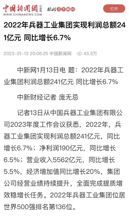 中國新聞網:2022年兵器工業集團實現利潤總額241億元 同比增長6.7%