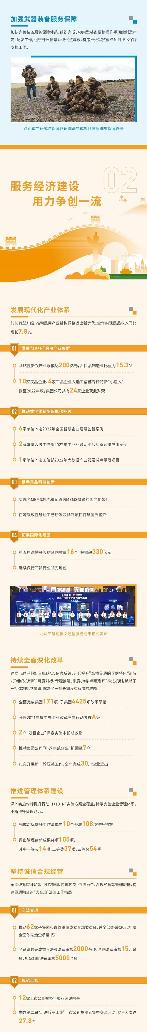 《報告》開篇設置“突出政治引領,全面加強黨的領導黨的建設”“沙場‘秋’點兵,中國兵器閃耀亮相珠海航展”兩個責任專題,聚焦集團公司加強黨建、強軍報國的擔當作為,書寫集團公司在新時代新征程上的奮進答卷。主體章節以“用心守護和平、用力爭創一流、用情溫暖社會”為主題,從恪守強軍首責、服務經濟建設、共創美好生活三個維度展現了集團公司立足“1+5”戰略和“雙十”規劃,聚焦新時代新征程新任務高質量履行政治責任、經濟責任和社會責任的具體行動和成效亮點,詮釋了集團公司服務國家戰略、服務國防和軍隊現代化建設、服務國家經濟社會發展的職責使命。